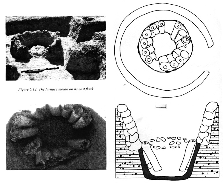 TST1. Four de réduction du fer à tuyères verticales. (Holl 2014, fig. 6.83 et 6.87 (en haut), 5.12 à 14 (en bas).