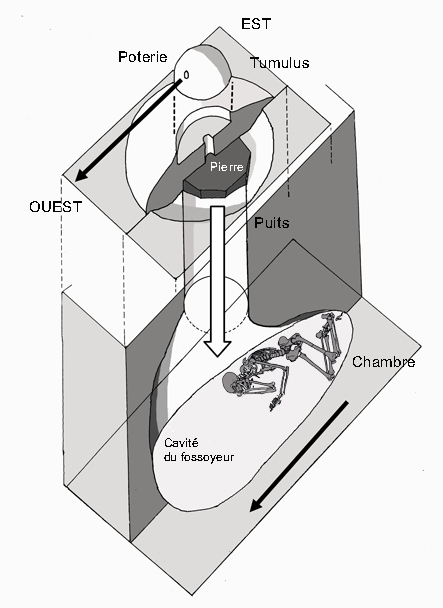 1. Chaque tombe regroupe des individus de même sexe appartenant à une même famille sensu lato. 2. L’inhumation primitive est celle d’un adulte plus ou moins âgé. 3. L’inhumation primitive se signale par un corps en position « hiératique » occupant la partie orientale de la chambre funéraire. 4. La ou les inhumations secondaires, sont celles de non adultes. 5. La ou les inhumations secondaires sont situées à l’aplomb du puits ; elles se signalent par des positions aberrantes comme on peut les rencontrer pour des morts d’accompagnement (qu’elles ne sont pas). 6. Les ossements du premier individu inhumé peuvent présenter des perturbations dues aux dépôts successifs, notamment au niveau de la tête et de la partie supérieure du corps. 7. L’orientation privilégiée par le trou percé dans la poterie de surface, importante pour l’idéologie de la mort, est identique à l’orientation donnée par le corps du défunt, dont la tête est également à l'ouest 8. Les hommes sont inhumés sur le côté droit, les femmes sur le côté gauche, le bras situé au contact du sol replié sous la tête, l'autre bras légèrement replié en avant du corps.