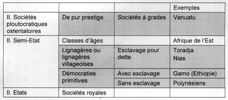 De plus, le statut des sociétés royales reste ambigu. Dans le tableau de 2005, les royautés sont rattachées au monde II, mais sont considérées comme déjà étatiques. Le séminaire du Collège de France (Testart 2010) n’éclaircit du reste guère cette question.