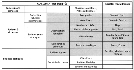 Fig. 3. Classement des sociétés à richesses selon Gallay 2016a, fig. 6). En grisé, sociétés mégalithiques. On notera que nous ajoutons aujourd’hui l’étiquette « cité-Etat » à la société konso subactuelle.