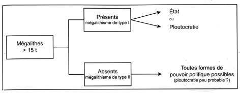 Fig. 4. Formes de pouvoir politique envisageables en fonction de l’existence (mégalithisme de type I) ou non (mégalithisme de type II) de mégalithes de masse supérieure à une quinzaine de tonnes (BB, fig. 14).