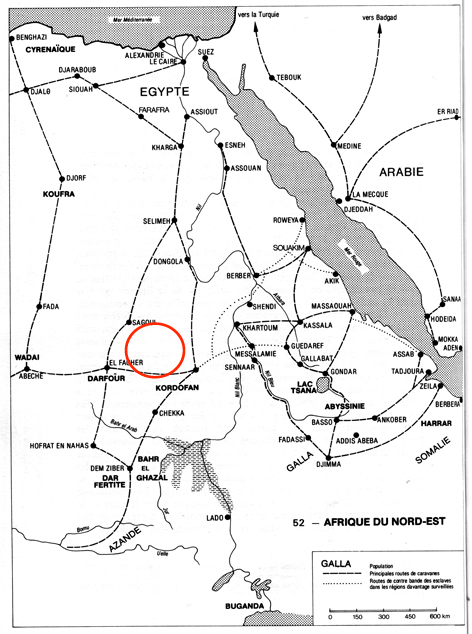 Fig. 10. Carte des routes commerciales acheminant les esclaves en direction du Caire. Cercle rouge : zone des tumulus à entourage quadrangulaire (Renault, Daget 1985, p. 176).
